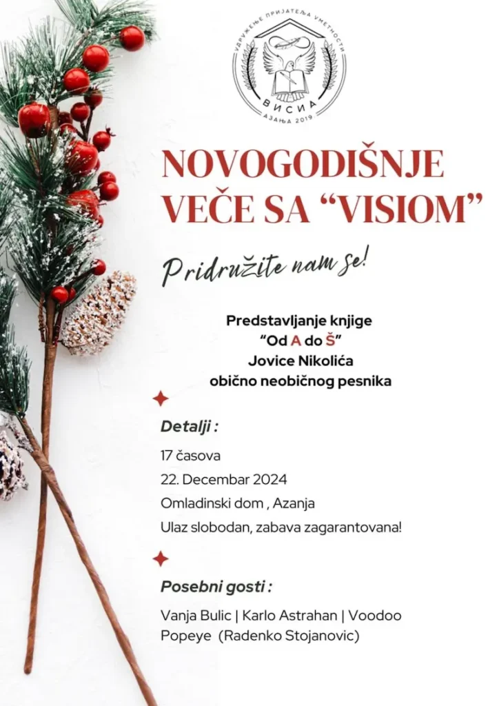 Представљање књиге "Од А до Ш" Јовице Николића обично необичног песника у 17 часова 22. Децембар 2024 Омладински дом, Азања.…