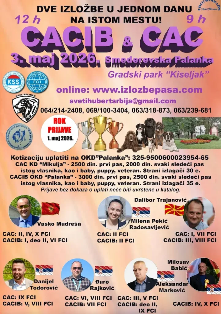 Љубитеље кинологије и расних паса 3. маја 2026. године очекује прави спектакл у Смедеревска Паланка. У Градском парку „Кисељак“ биће одржане две изложбе у истом дану – CACIB и CAC.