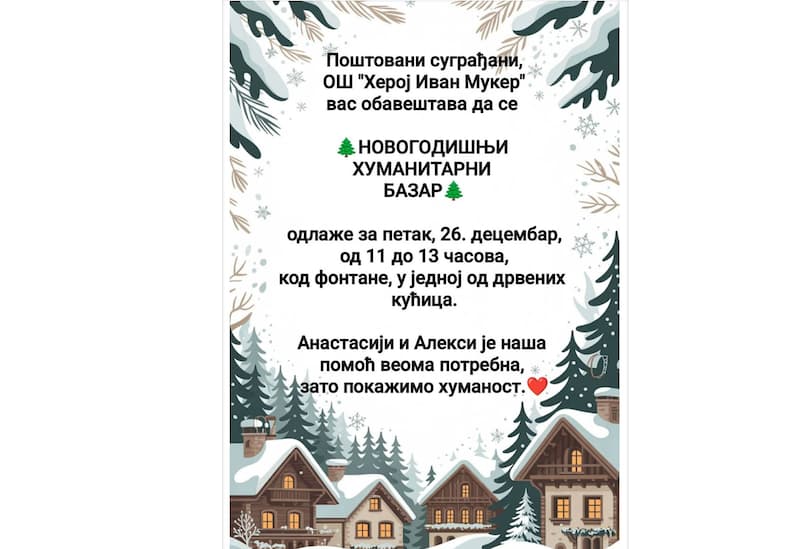- НОВОГОДИШЊИ ХУМАНИТАРНИ БАЗАР У ОРГАНИЗАЦИЈИ ОШ „ХЕРОЈ ИВАН МУКЕР“ 26. ДЕЦЕМБРА