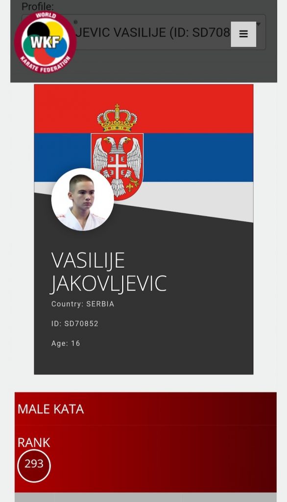 Налази се на одличном 293. месту у сениорској категорији ката појединачно, а има само 16 година јер су сви остали светски каратисти са листе старији од њега, њих ТОП 700. Од ове године ће се такмичити у категорији јуниора и тренутно је у тој категорији на 125. месту на свету јер је по WKF правилима пренео освојене бодове из категорије кадета.