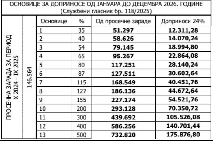 Од уплате за јануар 2026. године важе нове основице осигурања, које су за 11,6% више у односу на претходну годину и грађани могу да се определе за једну од 13 основица осигурања, независно од стручне спреме коју имају.