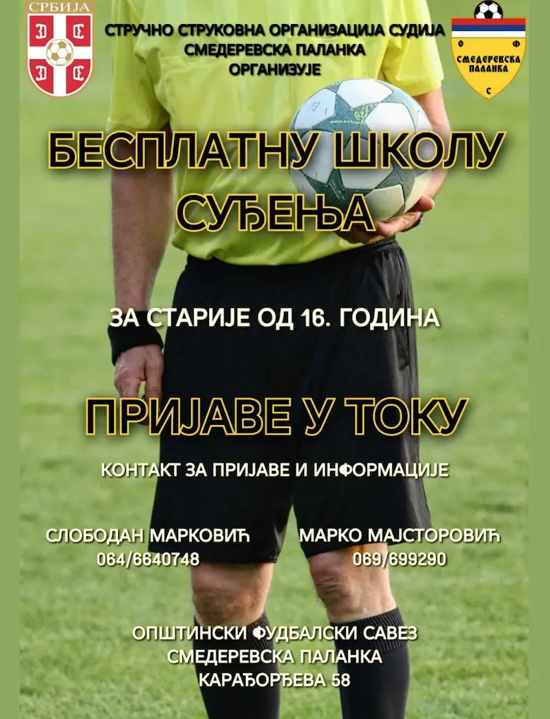 - БЕСПЛАТНА ШКОЛА ЗА ФУДБАЛСКЕ СУДИЈЕ У СМЕДЕРЕВСКОЈ ПАЛАНЦИ!Стручно струковна организација судија, при Општинском фудбалском савезу, у Смедеревској Палнци покреће акцију намењену едукацији будућих фудбалских арбитара.У питању је… Прочитај више: БЕСПЛАТНА ШКОЛА ЗА ФУДБАЛСКЕ СУДИЈЕ У СМЕДЕРЕВСКОЈ ПАЛАНЦИ!