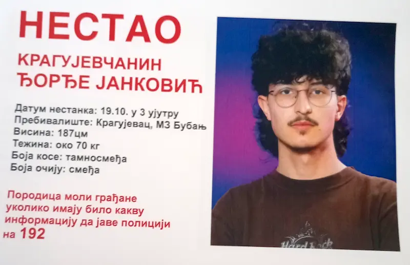 Породица и пријатељи трагају за Ђорђем Јанковићем из Крагујевца, који је нестао 19. октобра 2025. године, у раним јутарњим часовима, око 3 сата ујутру.